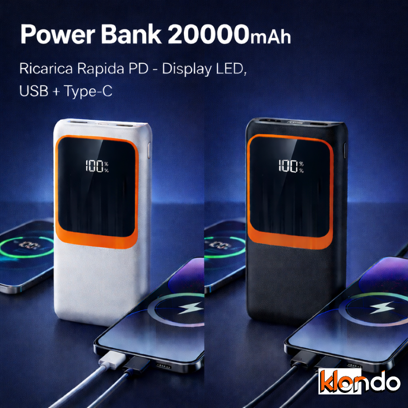 Power Bank 20000mAh Ricarica Rapida PD – Display LED, USB + Type-C, Ricarica Veloce